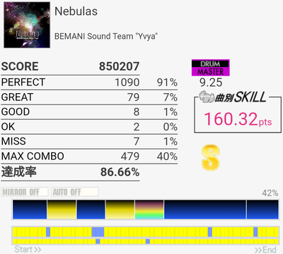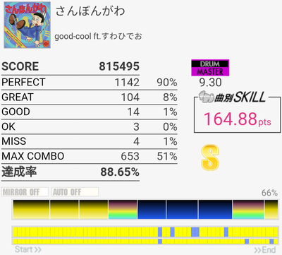 FT→LC+SN→LC+SNのところに完全に悪い癖がついちゃって叩けなくなってしまった。その前の2フレーズは以前なんで苦戦してたんだろうってくらい簡単に思えたので繋がるとは思うが。MASとのレベル差が縮まりすぎだよね。