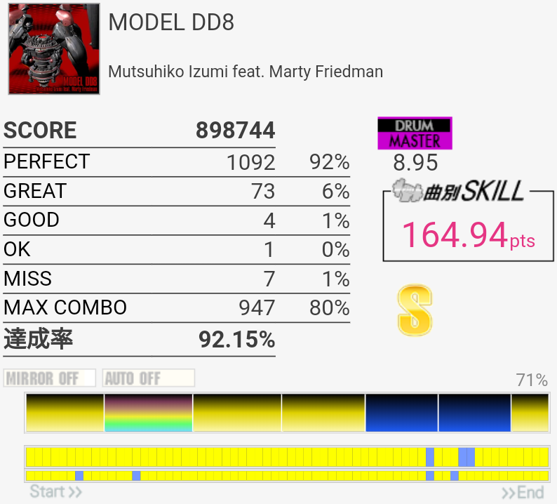SS取得。7フレーズ目はよくわかんなかったけど何も考えず見たまま叩いてたら終盤まで繋がってた。というか前半も譜面を全然覚えていなかったのでタムをけっこう強引に取ってた。