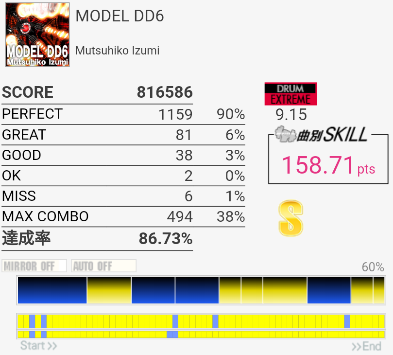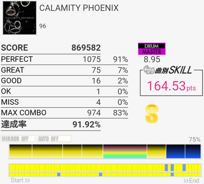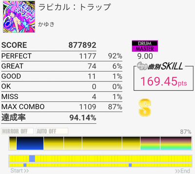 やっと2フレーズ目も繋がった!でもこんなもんなんだね。パフェ率低すぎかー。最後のシンバル入るときに左スティックが引っかかってミスしたのはもったいなかった。