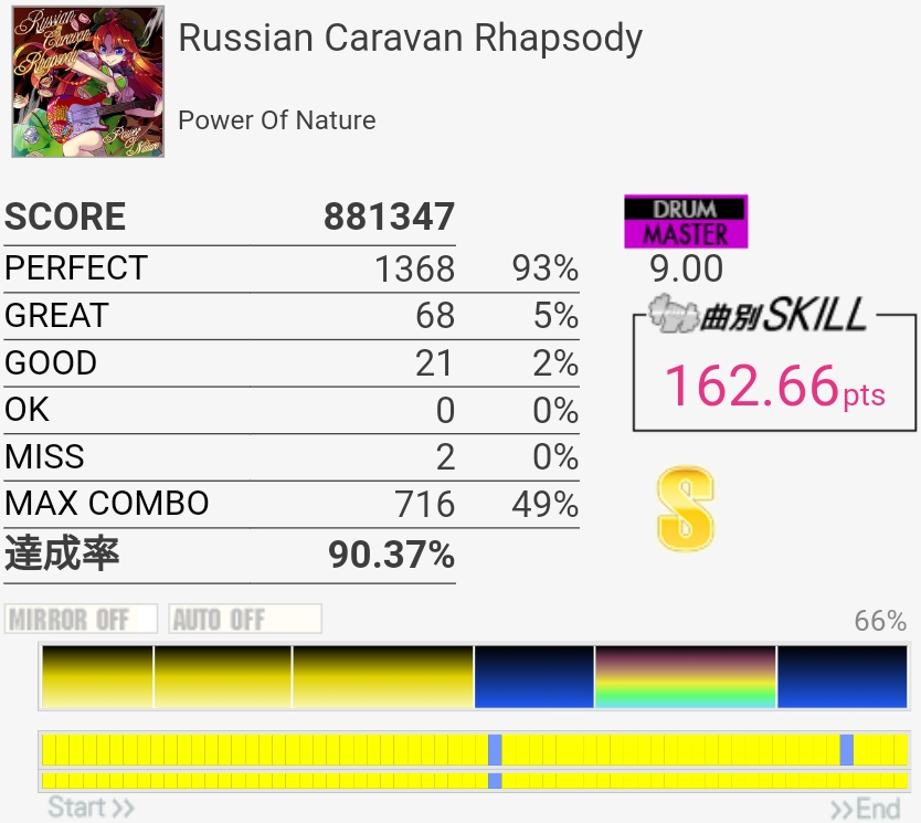 真ん中でスティック飛んだ。パフェ率もうちょい上げられれば170点あるかなあ。