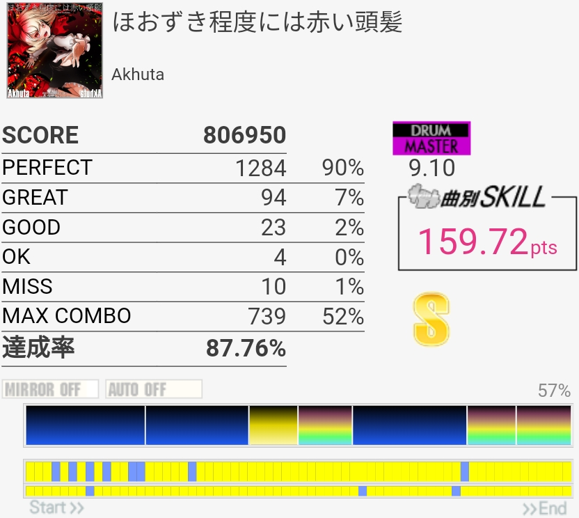 イントロ安定すればがんばれるかも……この曲をやってる途中でまたスティックにヒビが入って備え付けのスティックを使うことに。一週間くらいしか使ってないぞ。