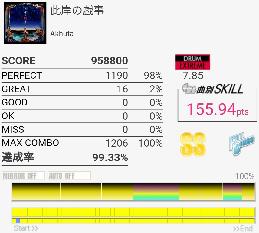 SS取得。最後完全に忘れてたな。そこ以外は落ち着いて譜面を見られたのでよかったかな。