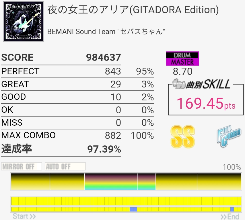フルコン。新しいスティックがちょっと重いおかげでパッドを叩いた感触もよくわかるのでSNがバッチリ入った。GOODは全部右足だと思う、ペダルが踏みづらいのが悪い。