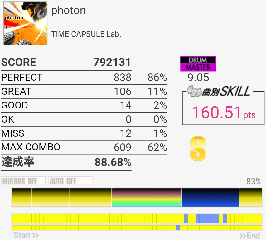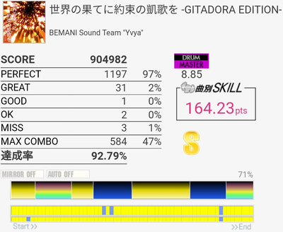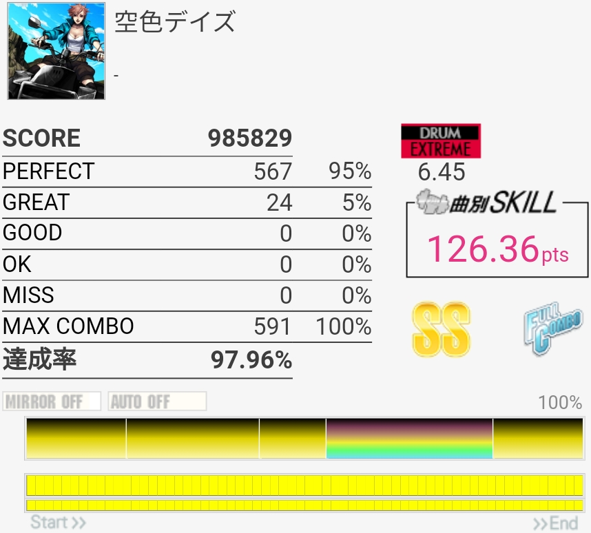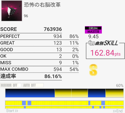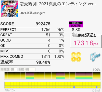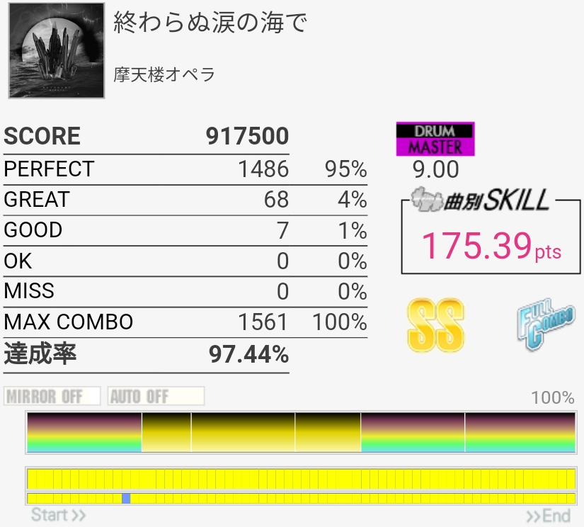 フルコン!GOODは間奏のツーバスだったかな?あそこ結局速さがわからないままだった。SS取れたからいいやって思ってたけどしつこくやっててよかった。