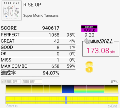 達成率0.3%、スキル0.5くらい伸びた。そう……イントロはけっこう繋がるようになってきたんだけどBメロのタム回し苦手なんだよなあ。LTかFTで左手を外してしまう。