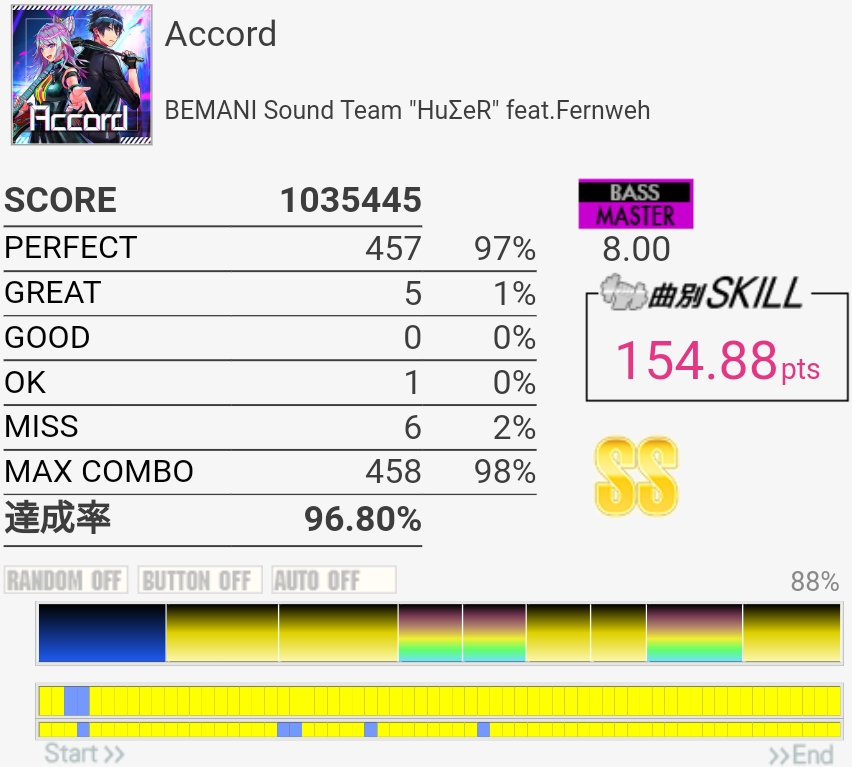 SS取得。最初ボーっとしてて見逃しちゃったけど以降は落ち着いて運指できた。複色も若干だけど見えるようになったのかな?