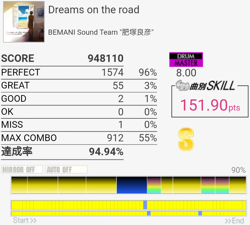 あんま譜面覚えてないけど2フレーズ目が繋がったのでフルコン狙って、終わってから「うまっ」ってなった。GOODは2フレーズ目の同時→HT×2だかで、GREATは最後の遅くなってるんだかなってないんだかわからないCYかな。