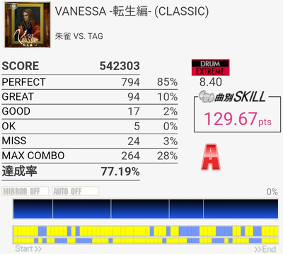 2回来る三連CYがキツい。それだけで自分にとっては9台前半になる。がんばったらなんか繋がったけど……それ以外も真ん中らへんと最後のよくわかんないタムが難しい。最後の連BP→偶数フィルからの奇数フィルはSN×3→HT×3を交互で取るとそのあともゴリ押しでなんとかなる、こともある。