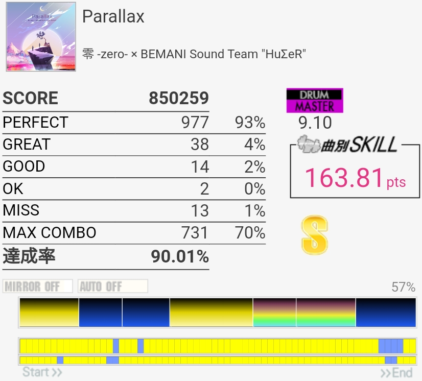真ん中らへんのタム回しがダブル混ぜないと取れないやつなのでそこそこ難しい、けどBPMそんなに速くないのでなんとかなった。最後のSN連打なんか合わないんだけど16分じゃなかったり?