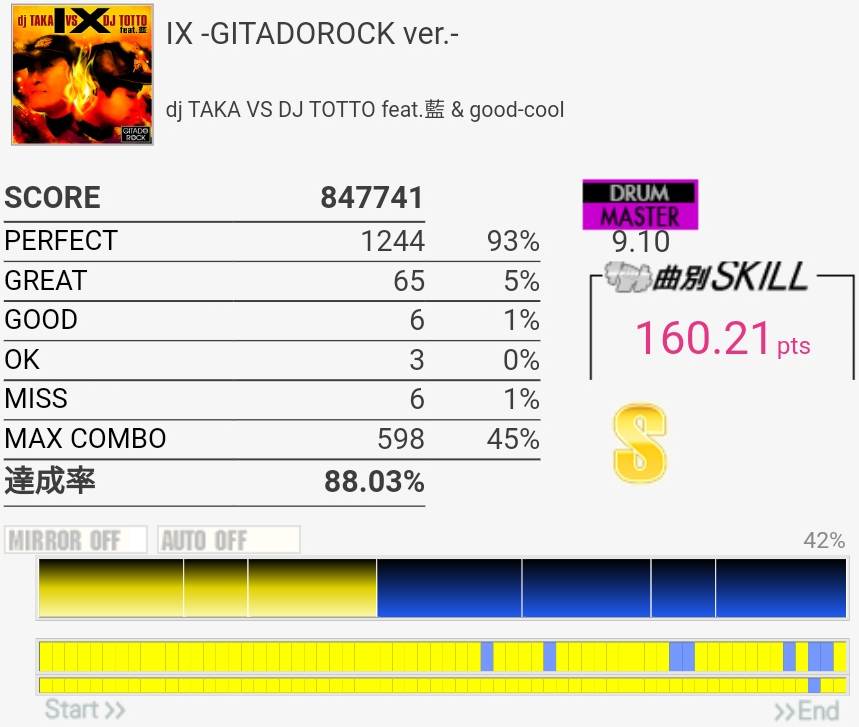 撮り忘れてたけど自己ベは87.79%。肥塚さんっぽいリズムで譜面は嫌な振り回しと入りづらい連打があってすごい苦手。真ん中らへんで難度値下がってるけどもっと高くていいと思うな。