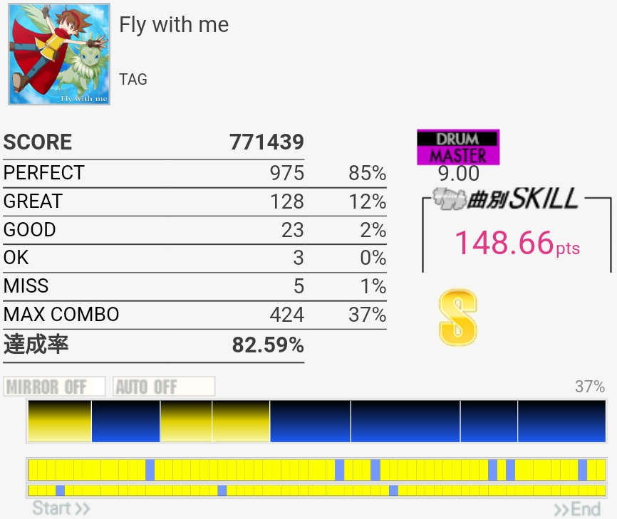 予習してたので16分CYもちゃんと叩けた。展開が繰り返す曲調だから譜面がゲーム的に楽しいかって言われると微妙なんですよね。