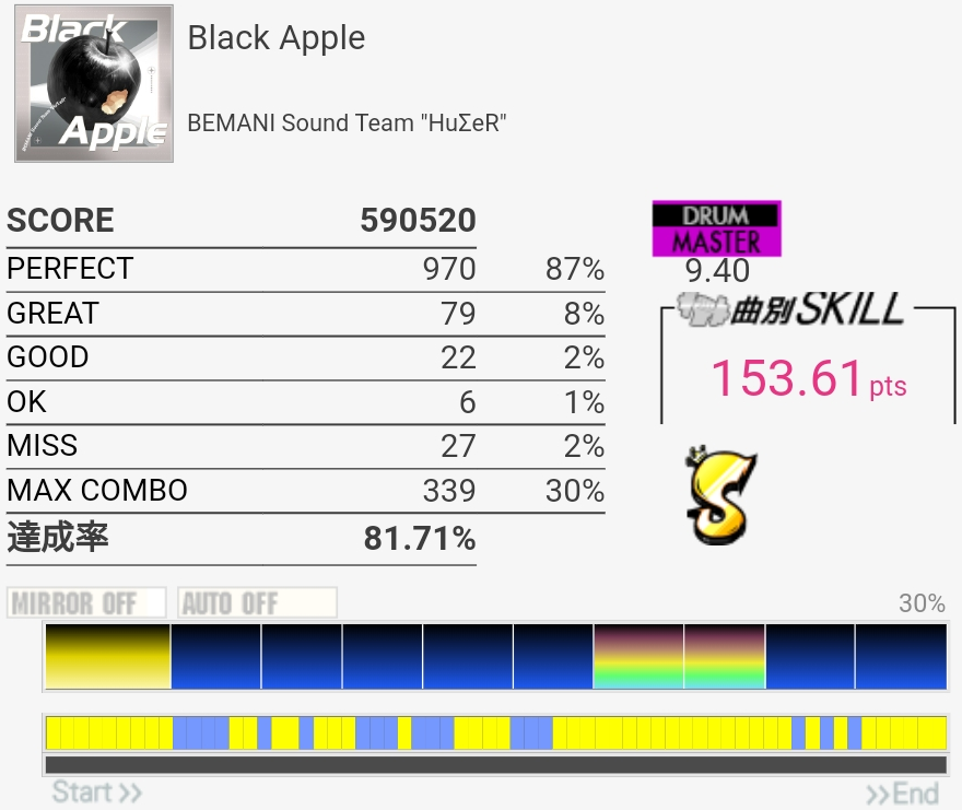 三連譜ツーバスやら後半のプログレ地帯が全然わかってないけど遅いからなんとかなってるみたいだ。コンボカッターになってる部分の形を全然覚えてない……。