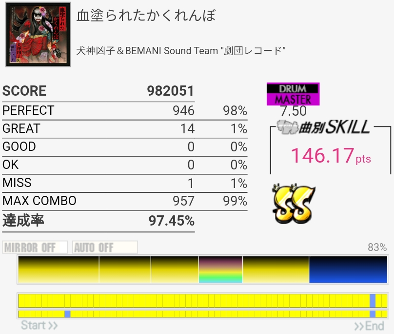 なんでこれこんな上がってんの???前のレベルで妥当かちょっと逆詐称だと思うけど……これも譜面忘れててパフェ率終わってるけど171点取れてればいいか。