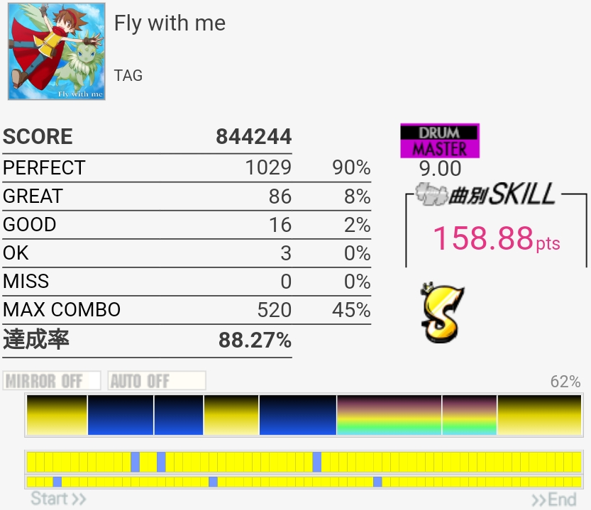 SS取得。Bメロ入るところの3個フィルを覚えてなくて叩けなかった。でもサビ前のフラム混じりSNと振り回しをちゃんと叩けたからオッケー。初めてかも。