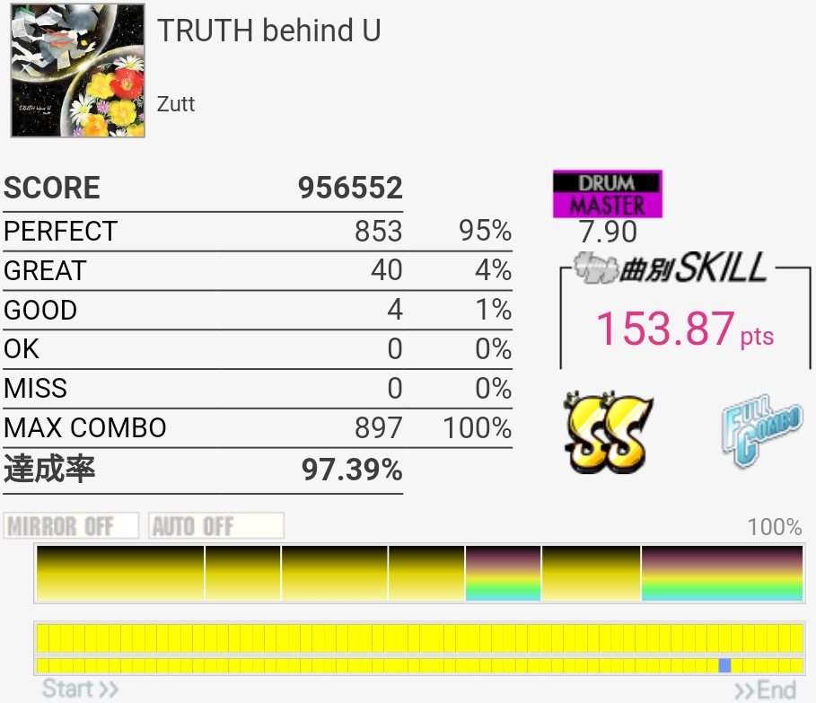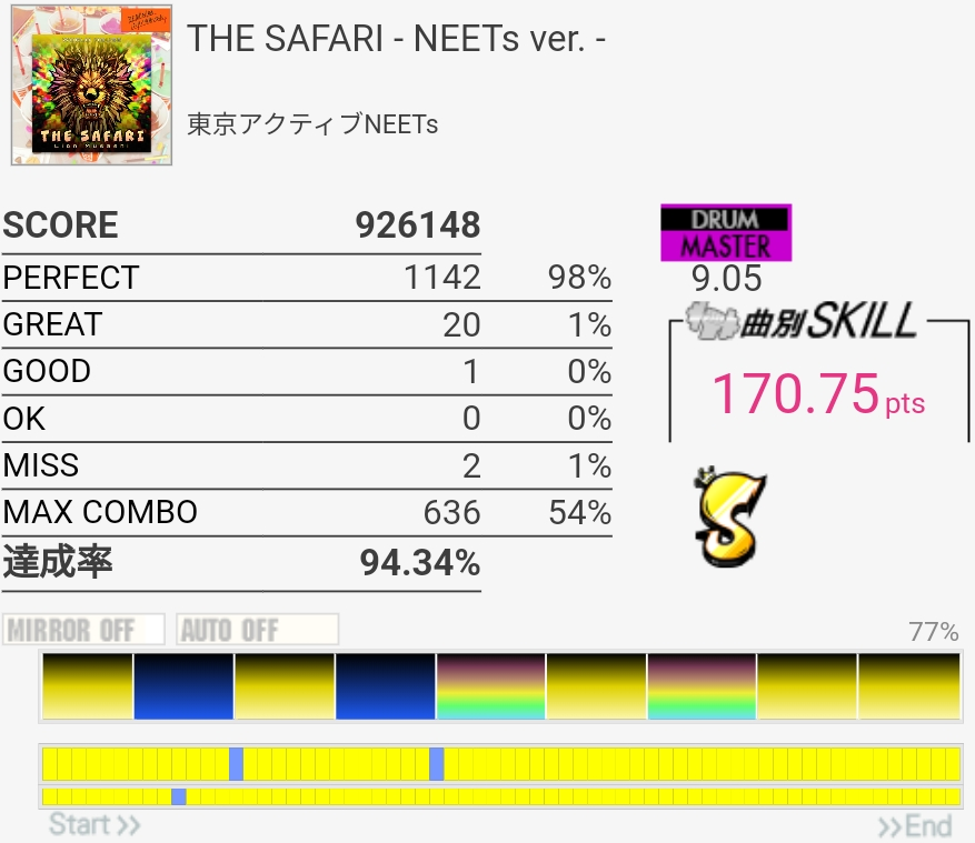 いいかげんSNの個数を覚えよう。2か所も切ったのに170点乗ってて不思議だったんだけどパフェ率けっこう高くね?ペダルがめっちゃ馴染むんだよなあ。