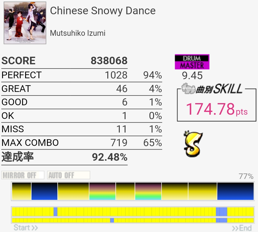 対象入り。いやパフェ率高くない?なんかLT反応しなかったのめっちゃ悔しいんだけど……Pフリーで粘着してて、イントロのFT×3→SN→HTでHTを左手で認識しちゃうのがなかなか治らなくて5分くらいイントロだけやってた。