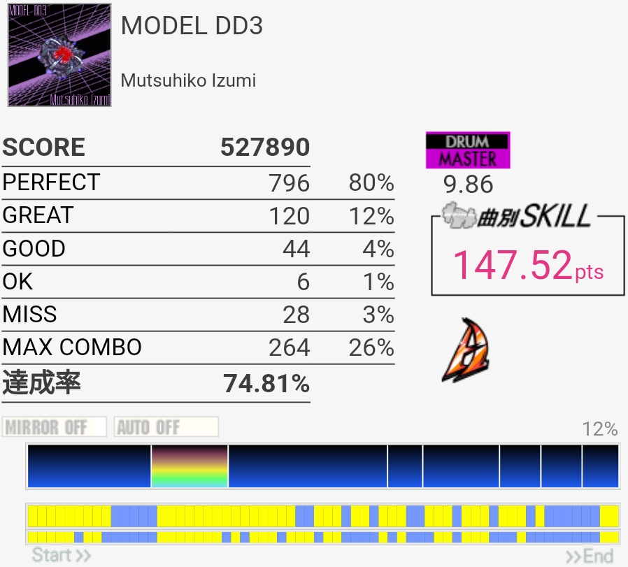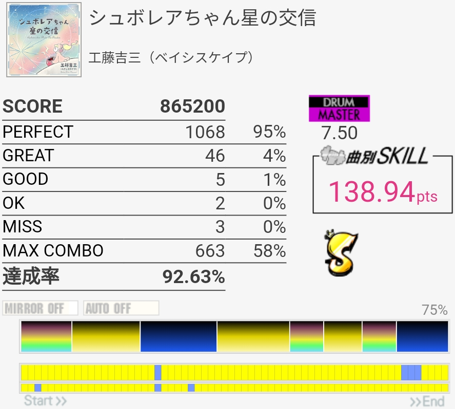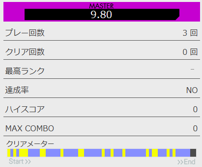 クリアできなかった(笑)いや笑えん。おそらくシングルで回せる部分が多いんだろうけど体感で天泣の倍くらい物量あるしコンチェみたいな連打が辛すぎる。そこから最後のよくわかんないタムで削られて……これ9.95でよくない?
