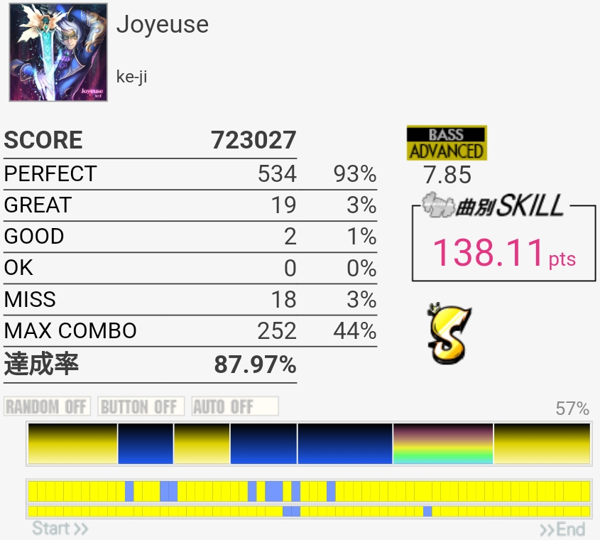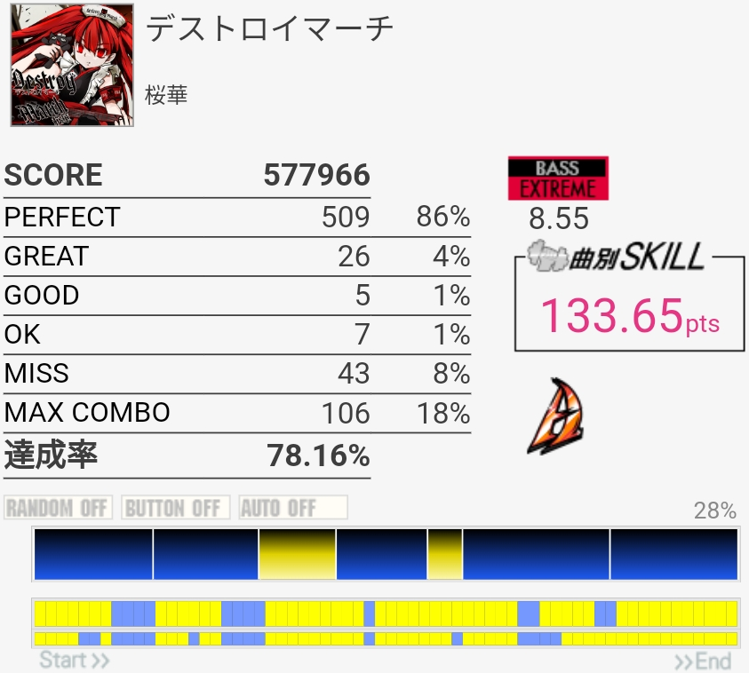 S取得。前半繋げられたのが大きい。サビの16分B→Rみたいな形はダウンで取ろうとしてめっちゃ切れたんだけど右手と左手どっちでミスってるのかわからん。