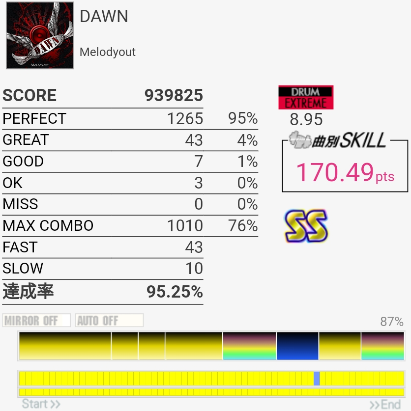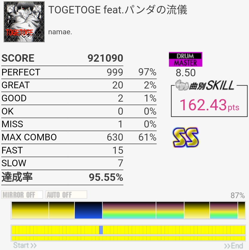 いつになったら終盤の叩き方を覚えられるのか。最後のフレーズの単純な8分SNがMISSになったのは謎。無反応起こりまくってたな。