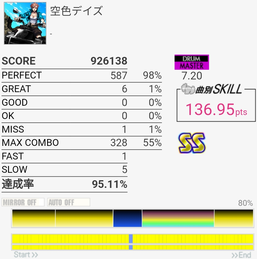 いきなりSS取れたのはびっくり。パフェ率低すぎて170点取れなかったけど……前半苦手すぎ。最後の部分は繋ぐの諦めてるけどちゃんと覚えるかなあ。そういうの潰していかないと上手くなれないのだと思う。