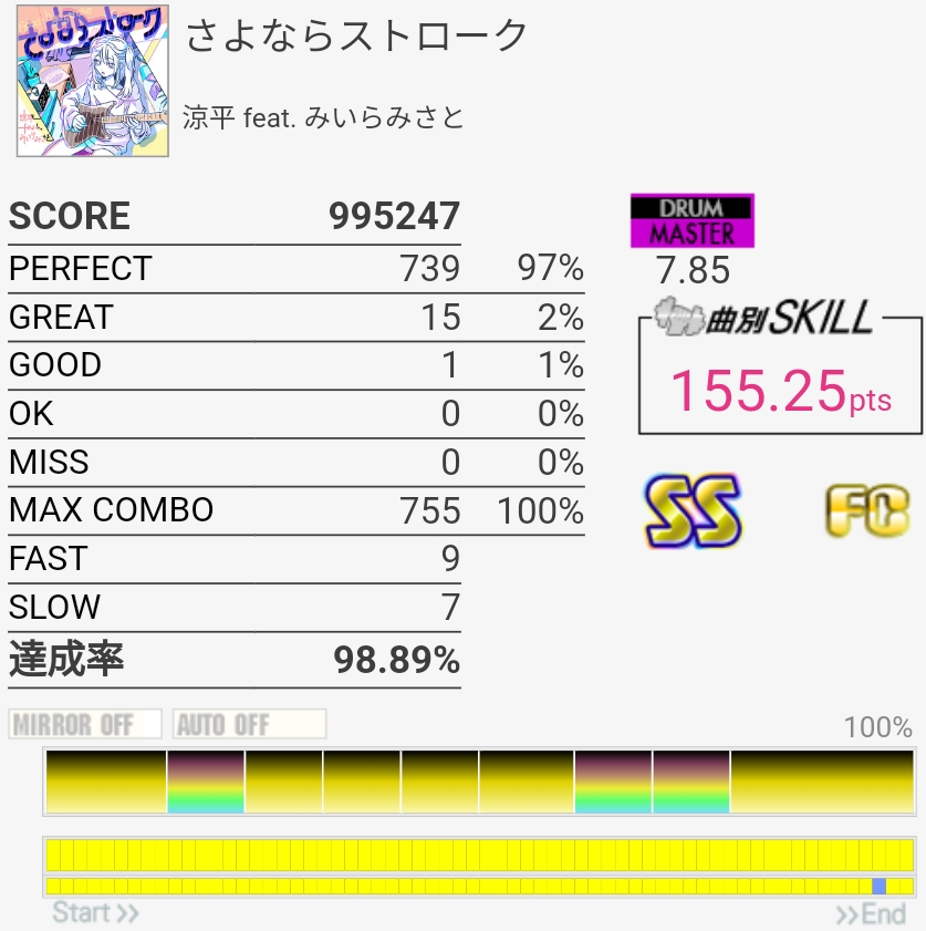 0.11%伸び。これ思ったよりBPM速いけどそこまで速くないので(意味不明)変なGREATがめっちゃ出る。フラム地帯以外で出したくないんだけど。