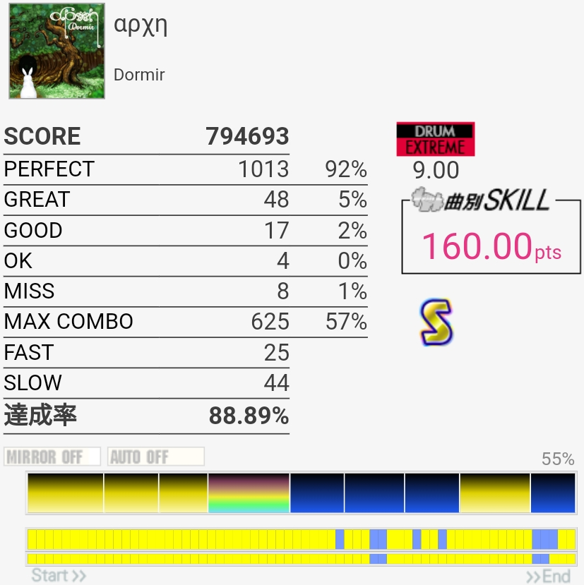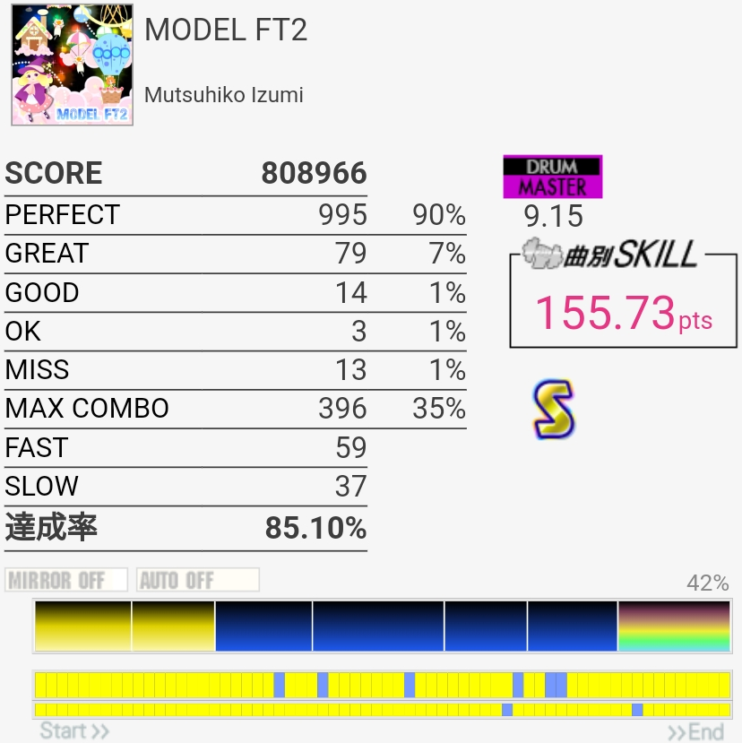 惜しい……のか?イントロのBP×2はこの速さだとつま先で踏む方がいい感じだという気付きがあったので伸ばせるかも……パフェ率もうちょい上げないとSS乗らないね。