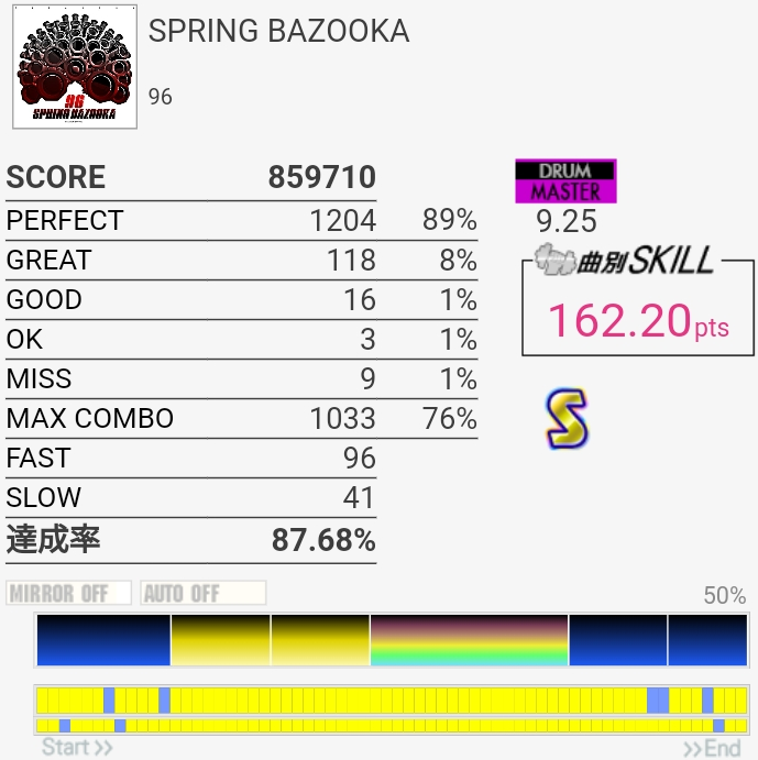 今日のWar evasion。このちょっとコンボ繋がってるのが俺を狂わせる……やっぱホームのペダルだと跳ね返り弱すぎて無理なんじゃないかな。