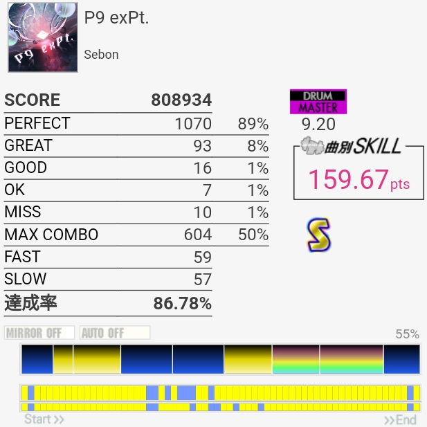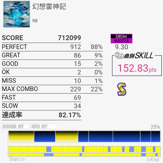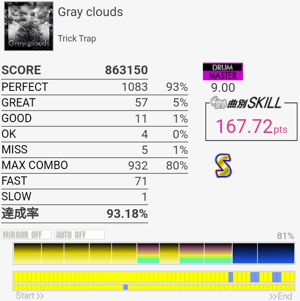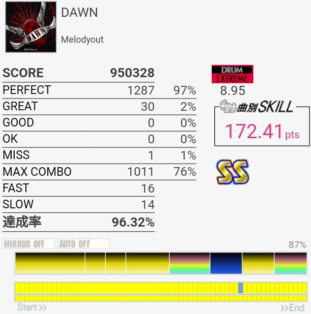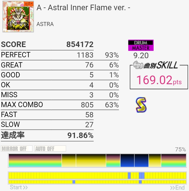 なんかめちゃめちゃ伸びたんだけど6フレーズ目のSNフラムと11フレーズ目の三連符SNにダブル混ぜるところで無反応起こして泣いた。172点で対象入らないのも辛い。手が動かない状態でタム回しが繋がるってことはやっぱりいつもは速く叩こうとしちゃってるんだな。