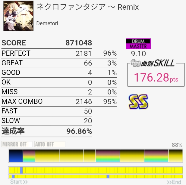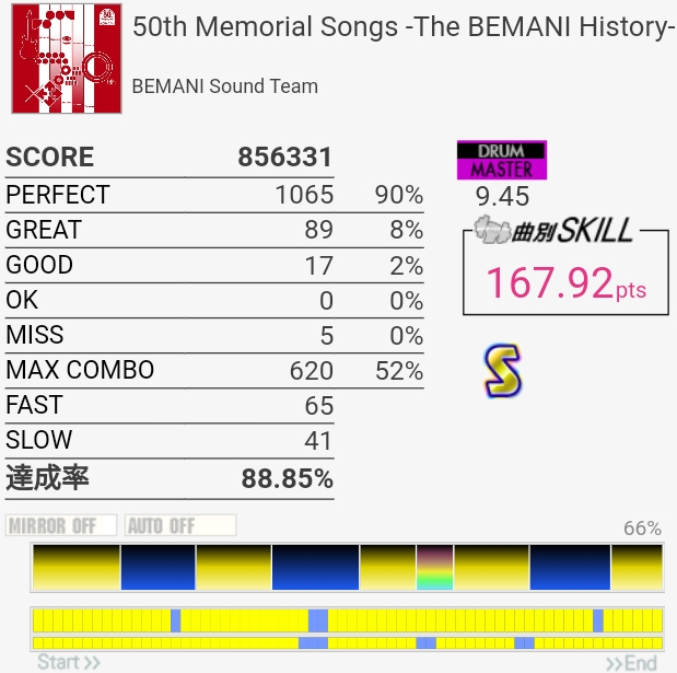 パフェ率だけよかったけど毎回同じ切り方してる。速いツーバスのところは左足が抜けちゃうし、SN×3は今回は交互で叩こうとしたけど手が追い付かん。どっちかだけでも繋がってくれないかなあ。