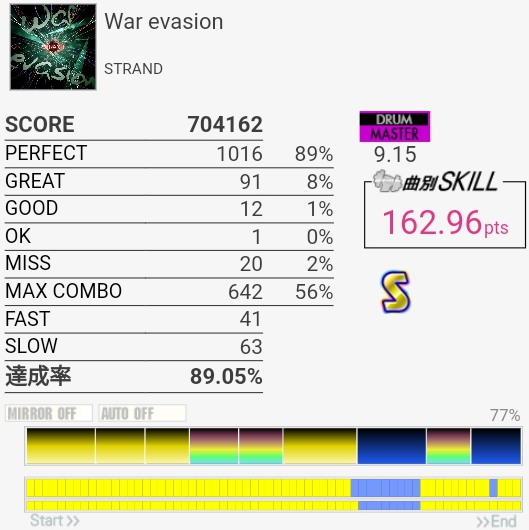 今日のWar evasion。そもそも右手がズレたので問題外だった。最後らへんのLTが反応しなくて切っちゃったけどこれがコンボ繋がってる時に起きたらと思うと……。