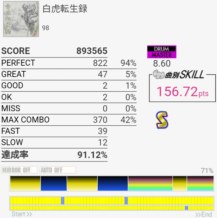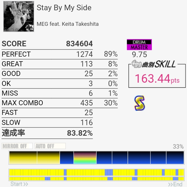 MEGさんがプレアン曲に抜擢されるとは……あさき以外で男性ボーカルプレアンってのも珍しいよな。譜面的には普段だったら170点は取れると思うんだけど今日はダメダメだ。見てよこのSLOWの数!たぶんイントロのBP+タムで半分くらい出てて見た目以上に難しいかも。叩きづらいSN→LT→FT×2が叩きづらい形で来るのと、後半の変速ツーバス、8分SN+CY連打、ラストのクソ速4-4-4-4と難しい部分は多いけど9台後半の理不尽さはないし、MultiverseとかDOGMAより上ってことはないと思うが……。