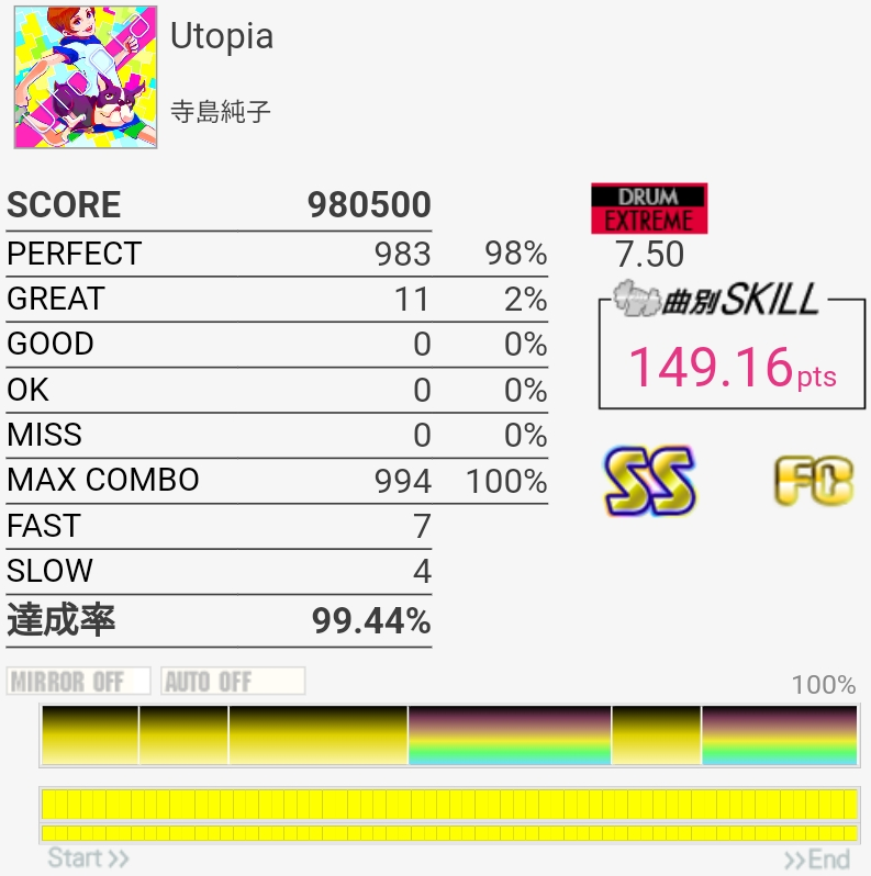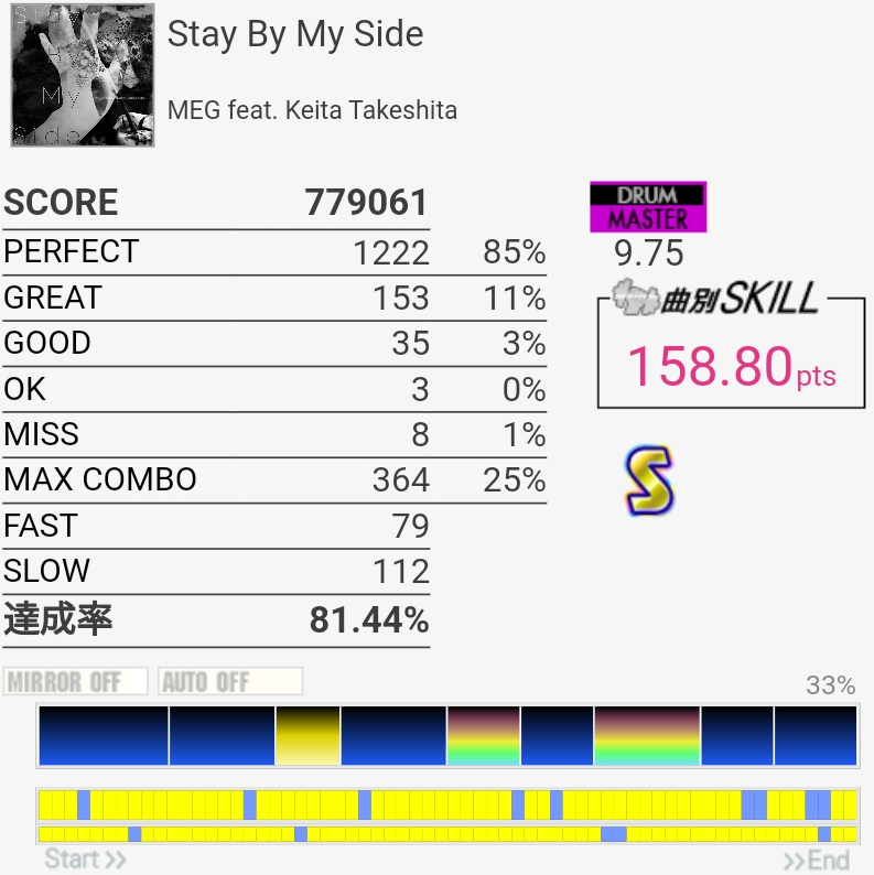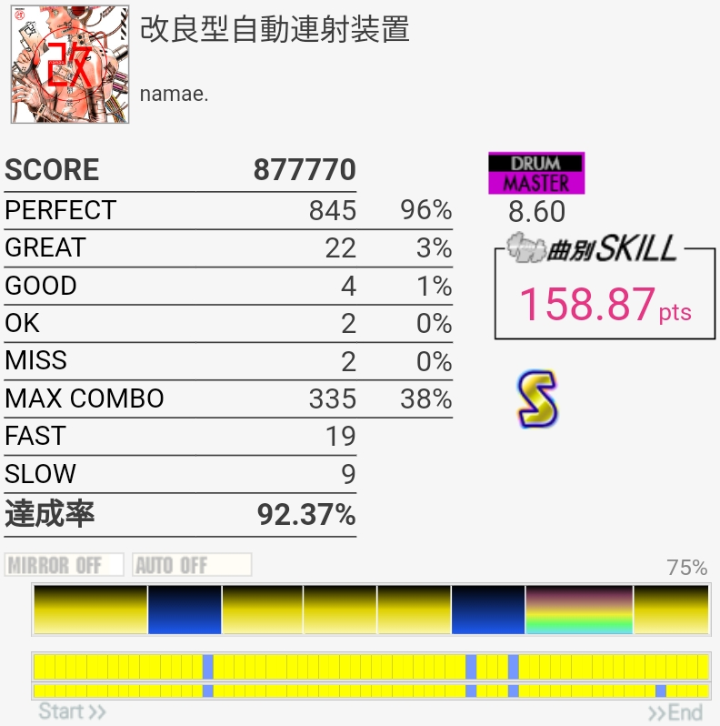 曲名の時点で癖が強そうな予感はしてたけど思ってたのとは違う感じだった。SN連打は左ダブルと右ダブル両方あるのかな……?一番長いところはRLLRLL繰り返しで勝率2割くらい。うちの筐体だとイントロのHT×5→LT×5→HHも入らないし2フレーズ目のSNも運ゲーだし後半の片手HH×3も抜ける。曲はカッコいいのに楽しめない……。