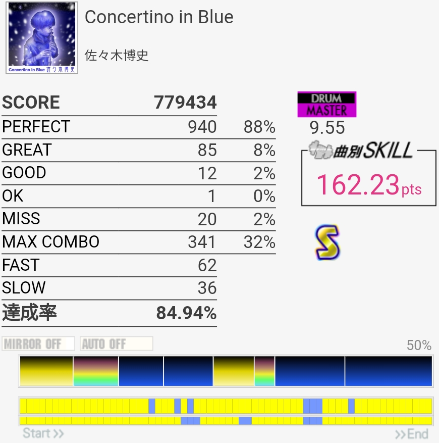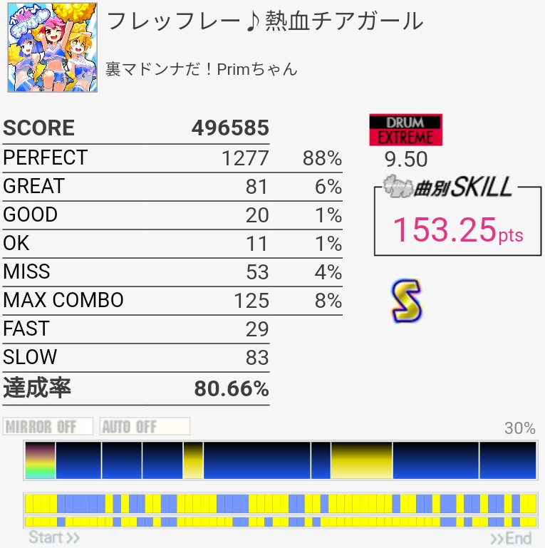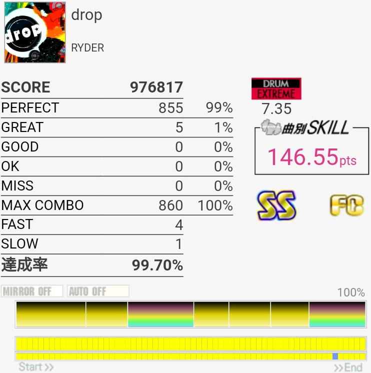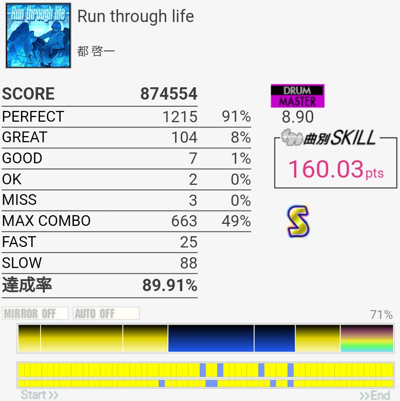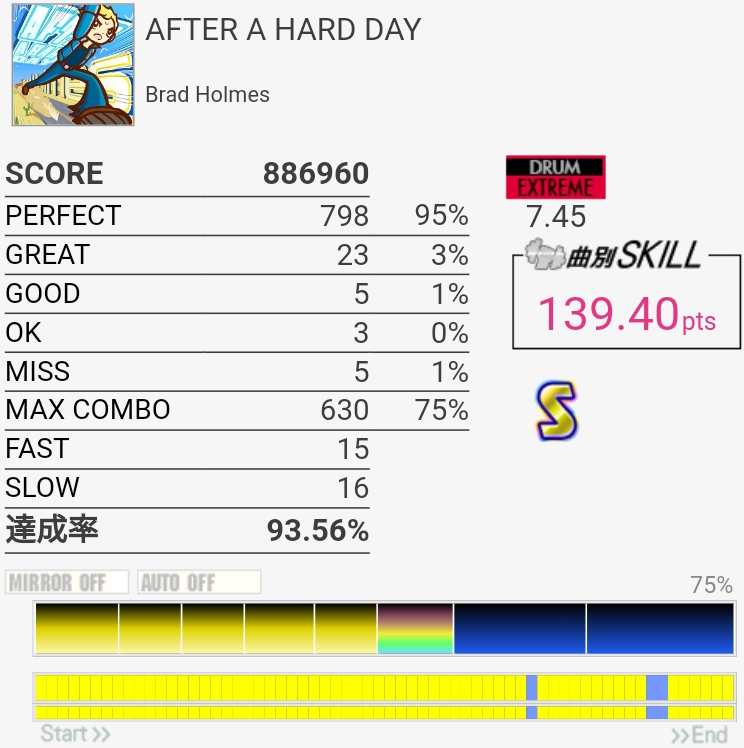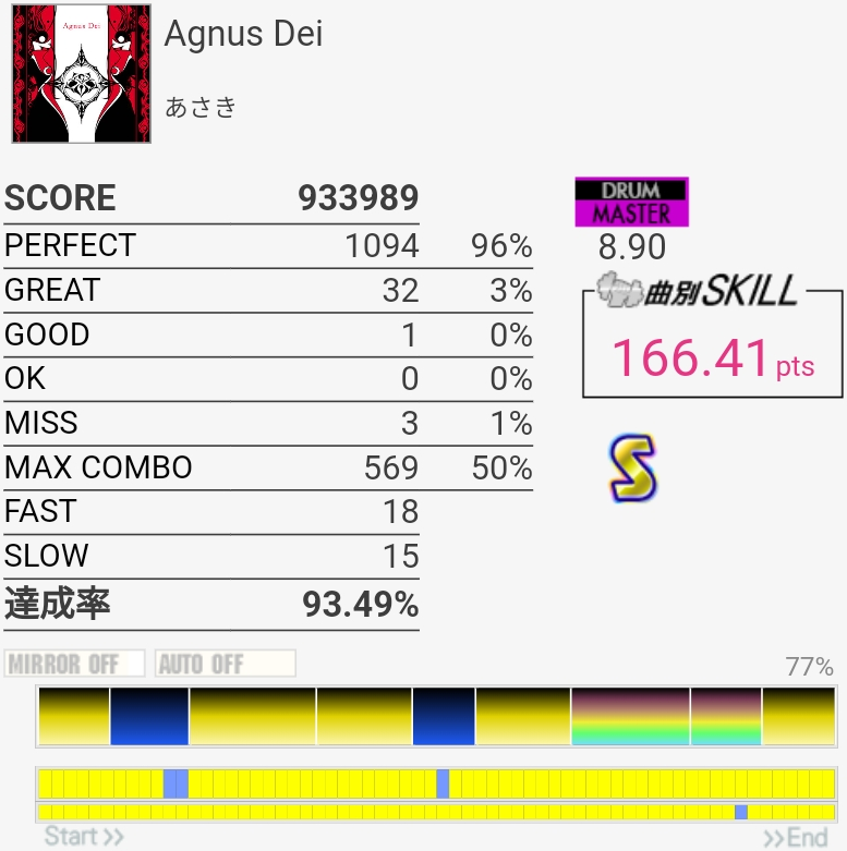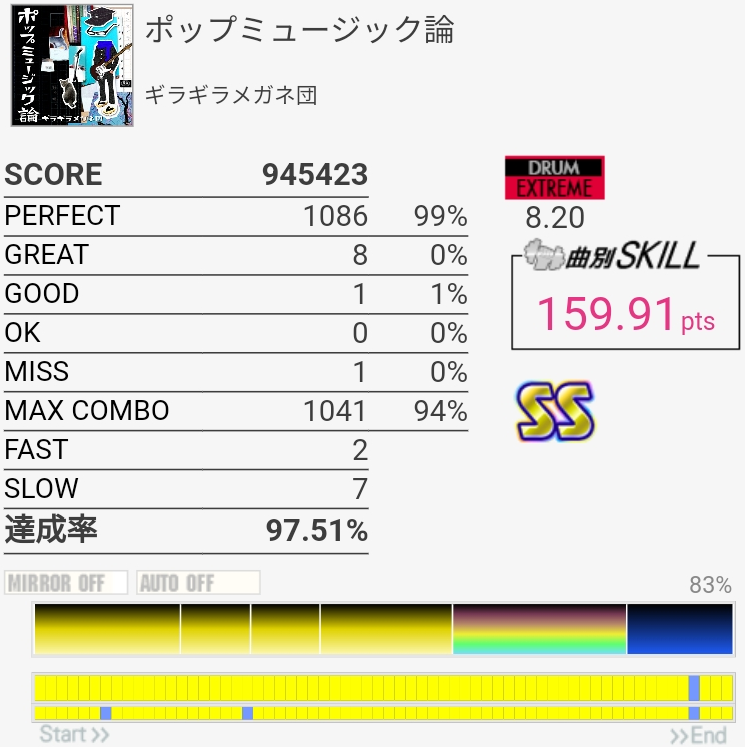 SS取得。今日はわりと腕に力が入っててタムをしっかり叩けたんだけど最後の16分SNからの同時で切ってしまった。ちゃんと叩いたと思うんだけどなあ。