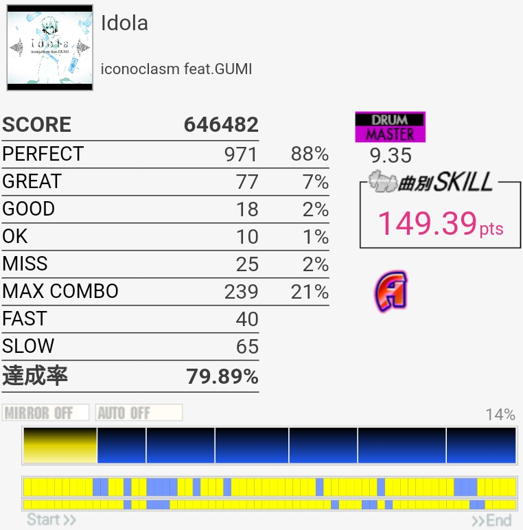 何気にフルコンは初。イントロで5個出た以降は全パフェ……ラストのフラムも完璧だった。もったいな。