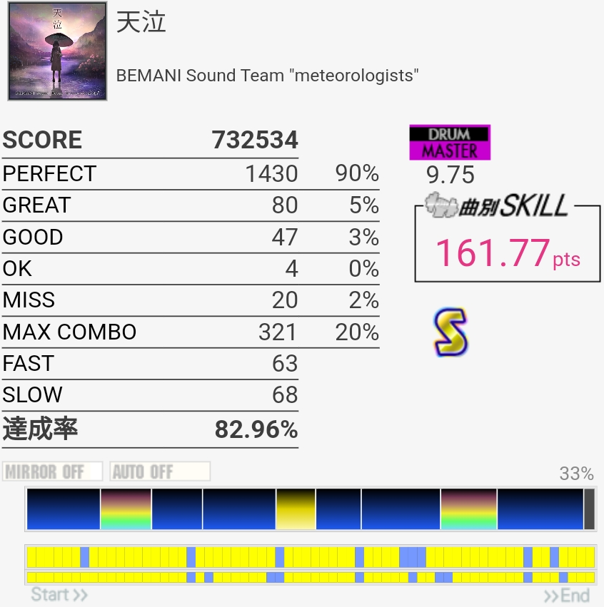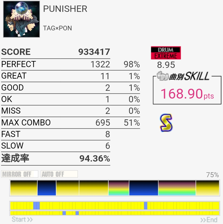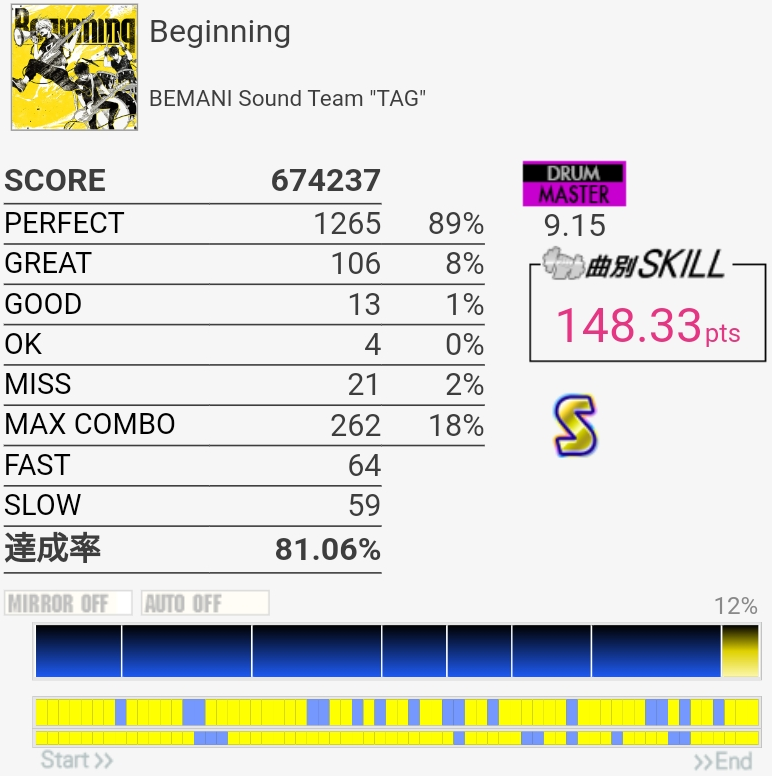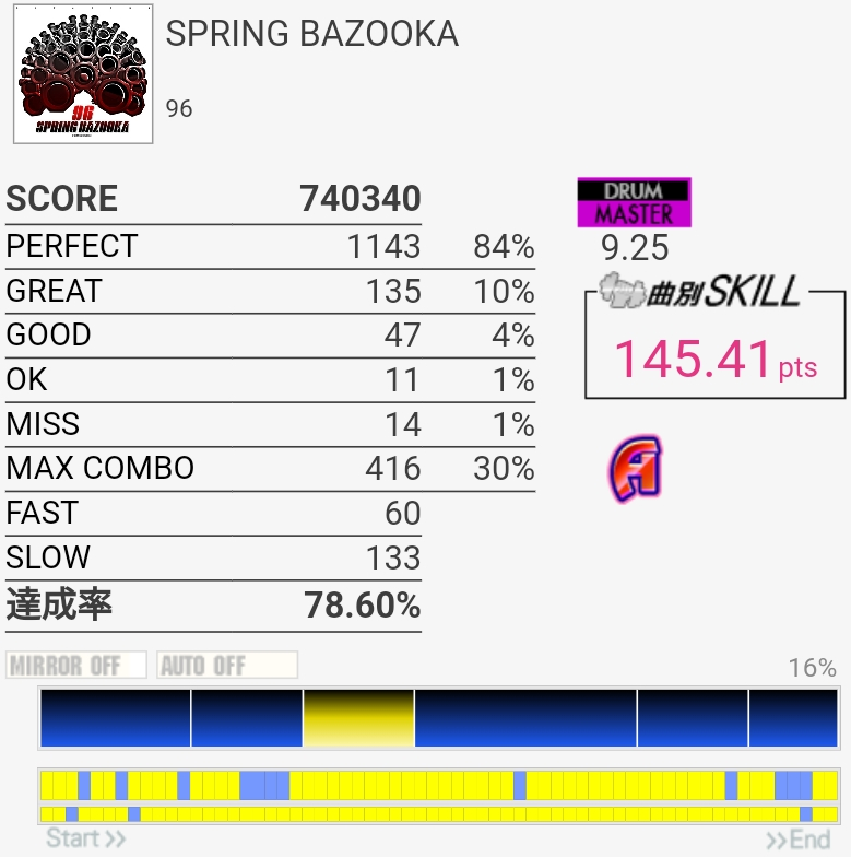 FT→SN×5が普通に交互で叩けるはずなんだけど認識おかしくなるんだよな。5フレーズ目終わりのタム回しを誤魔化せればワンチャン伸びそう。