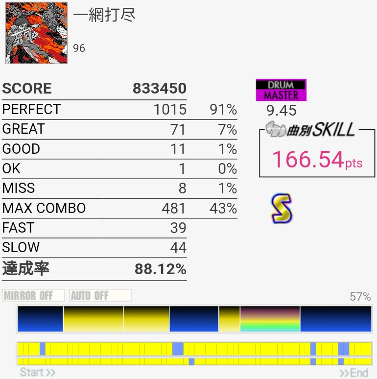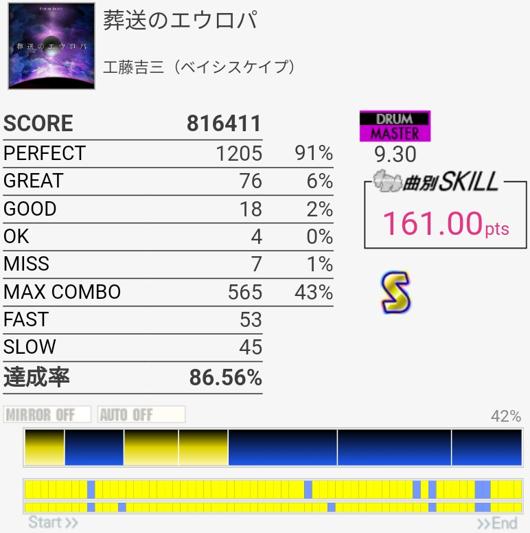 イントロのFT叩けなかったけどうまかった。やっぱりFT→SNに戻るのが難しい。
