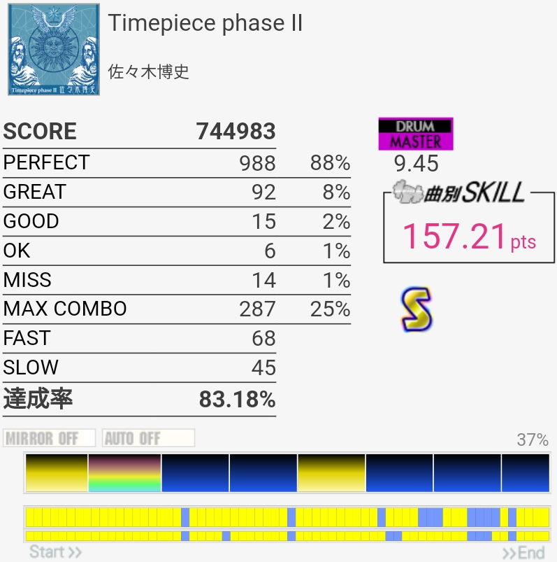 S惜しかった。イントロアウトロのSN×4はLLRLで取るのがズレなくていいかな?この譜面でキツいのSNフラムとCY×3なんだけど。