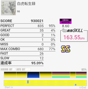SS取得。SNちゃんと叩いたと思ったんだけど……タムから戻り切れなくて変なところ叩いたのかな。