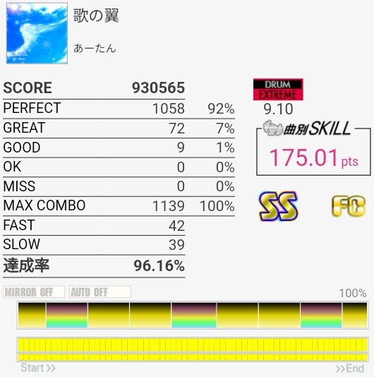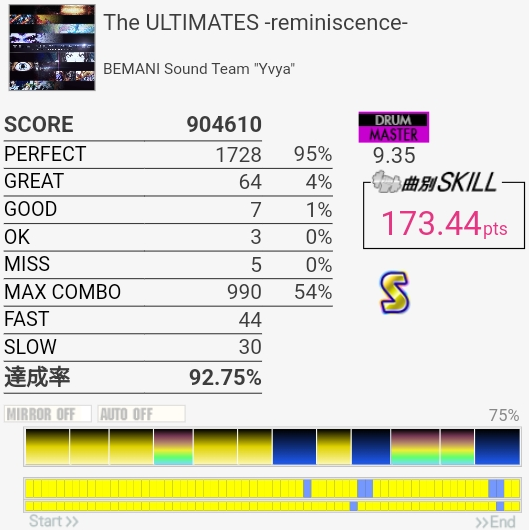 SS取り直して175点!やっぱラストのFTからの戻りがムズすぎ。道中のタム回しはしっかり引き付けて叩けたからめっちゃよかったと思う。この辺から調子が上がってきたかな。