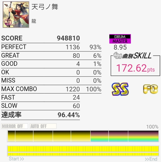 なんか最後でペダルが変な反応して終わった。8.85だと98.9%取らなきゃいけないのでどちらにしろダメだったんだけど……3連CYでめっちゃGREAT出た。