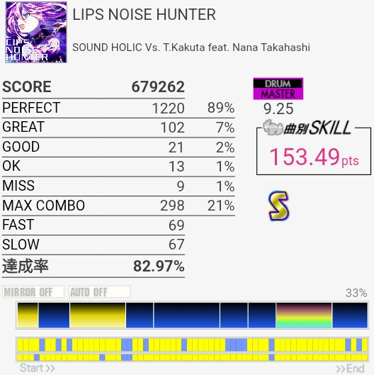 ちょい伸び。譜面動画を見て曲も何回か聴いてやってみたけどシンプルに難しいな。ツーバス踏みながらのCYがなんかめっちゃ叩きづらいのは画面がデカくてCYノーツを見づらいのもあるとは思うし、それはそれとして譜面の判定が全体的にFAST寄りにズレてると思う。