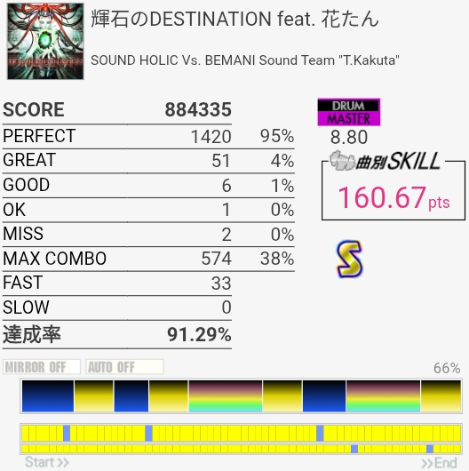 譜面見た時に予想してたけどシンバルタム同時のところの癖つき具合がヤバい。一番の難所は最終フレーズ入りのLT×3→LC+SN連打だろうな。これを少し粘着したおかげでその後感覚が狂ってしまった気がする。どうでもいいけどプレー履歴でSLOW数が表示されなくなっている。