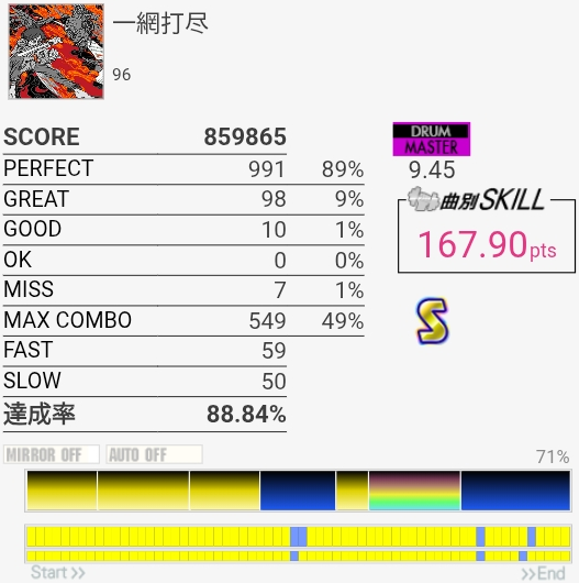 SS取得!2フレーズ目は前にHHとSNの絡みが~とか書いてたけど、絡んでるのLTだったわ。直前のHHと記憶が混ざるほどに譜面をちゃんと見ていなかったらしい。LT→左手SNダブルを2回やればよかった。調子よくないとイントロが叩けないのと、5フレーズ目終わりのなんかいっぱい叩くところでSNが抜けがちだからフルコンはどうかな~対象入れたいな。