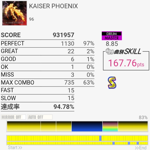 パフェ率はともかくけっこう惜しい感じがする。ペダルがふにゃふにゃすぎて連バスを踏むのがしんどい……。