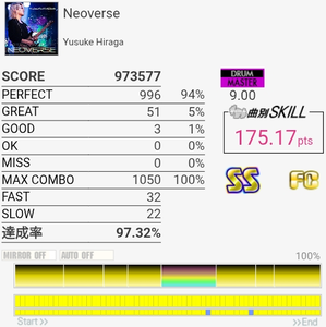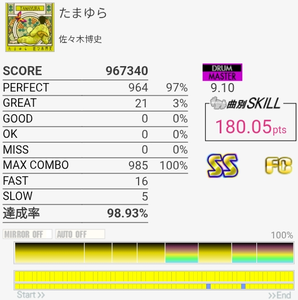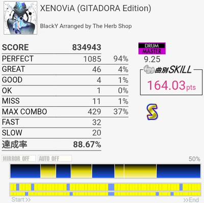 譜面を把握すれば徐々にできるようになる譜面ではある……でも速いのでキツい。イントロのツーバス踏みながらCYからの16分LT→SN連打とHH+SNからの16分SNに早速癖がついたのと、中盤のCY→LT×3→LC→SN×2→LCみたいなところが動きが辛くてそこが最難所かも。その後の16分ツーバスを踏みながら三連符?でLCとHHを叩くところは椅子が下がるせいで体勢が崩れちゃう。最後のフレーズの急に来る追い越しは忘れてるとヤバいしラストの譜面が認識しづらいので全然安心できない。ラクリマは一週間経ったらS取れたのでこれも疲れてない時にやればもうちょい伸びるかもしれん。あとEXTがやってることあんま変わんない抜き方でダメ。